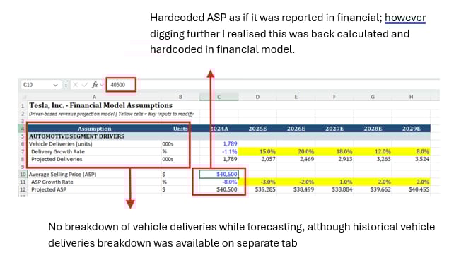Hardcoded 2024 ASP: Opus calculated and hardcoded the 2024 average selling price as if it was in the 10-K, but it wasn't actually disclosed. It back-calculated from revenue and units, then treated it as a given. That's problematic.